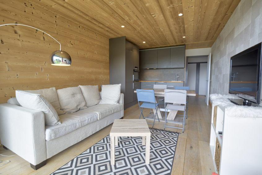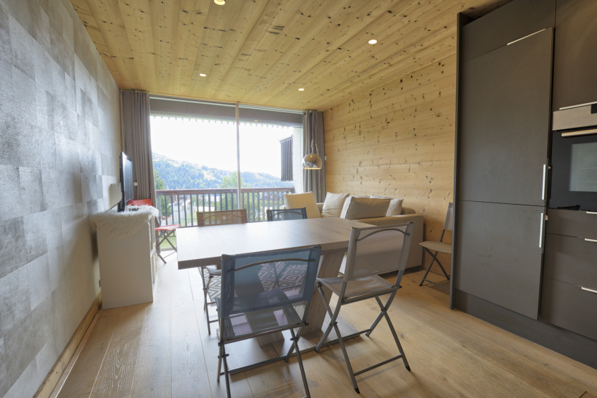 Apartment LEBERT. Les ALPAGES 3. 3 rooms, 6 persons, 43 sqm, 3rd floor, balcony SOUTH exposure, open view on the village, the Mont Charvin and the valley. Ski-in/ski-out!