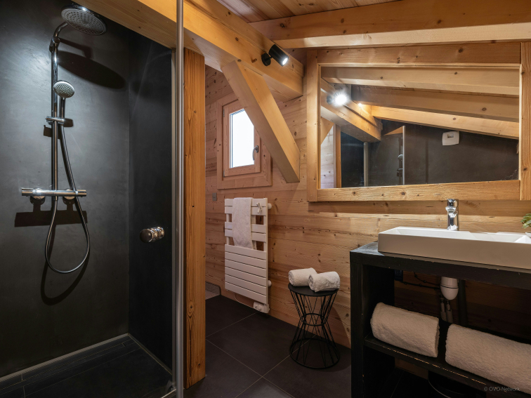 The open-plan living room with fireplace, fully-equipped kitchen and dining table occupies the first floor. Large bay windows on one side let in natural light and open onto a terrace, furnished with a second table and sofa, with magnificent views of Mont Charvin and the Aravis mountain range.
