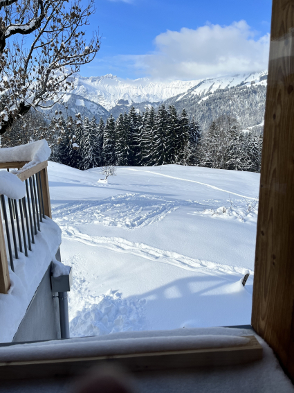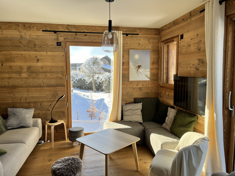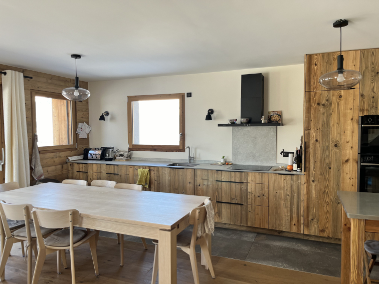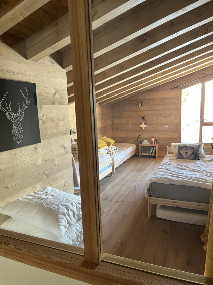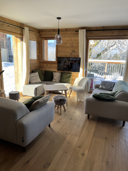 New family chalet, 4 bedrooms + 4-bed dormitories, comfortable and cosy, in Crest Voland, village center, quiet, Aravis and Charvin views. East/South/West facing, very bright.