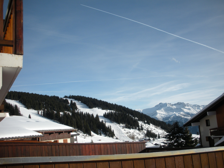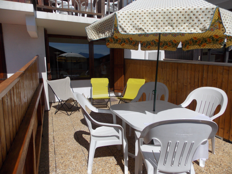 • Rez de terrasse avec une exposition plein SUD (équipé 3 transats + salon jardin et parasol), casier à skis et parking de la résidence.