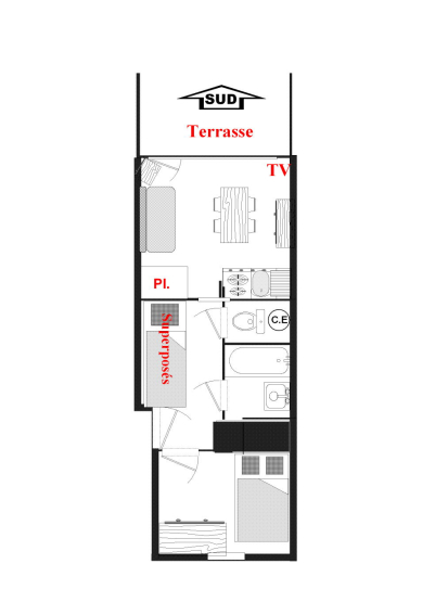 - Cuisine ouverte sur séjour : deux plaques électriques, mini four, micro-ondes, lave-vaisselle, réfrigérateur.