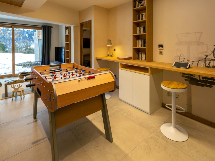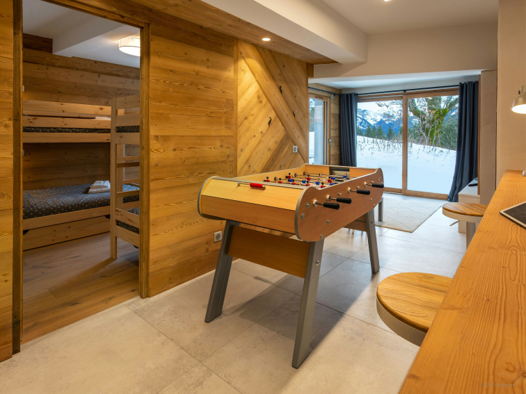 Il a été aménagé spécialement pour les familles, avec deux espaces de jeux / télévision pour les jeunes vacanciers, ainsi qu’une grande pièce de vie très lumineuse, qui inclut une cuisine équipée, un espace salle à manger avec cheminée, et un confortable salon. Des portes-fenêtres mènent de cette pièce au balcon.