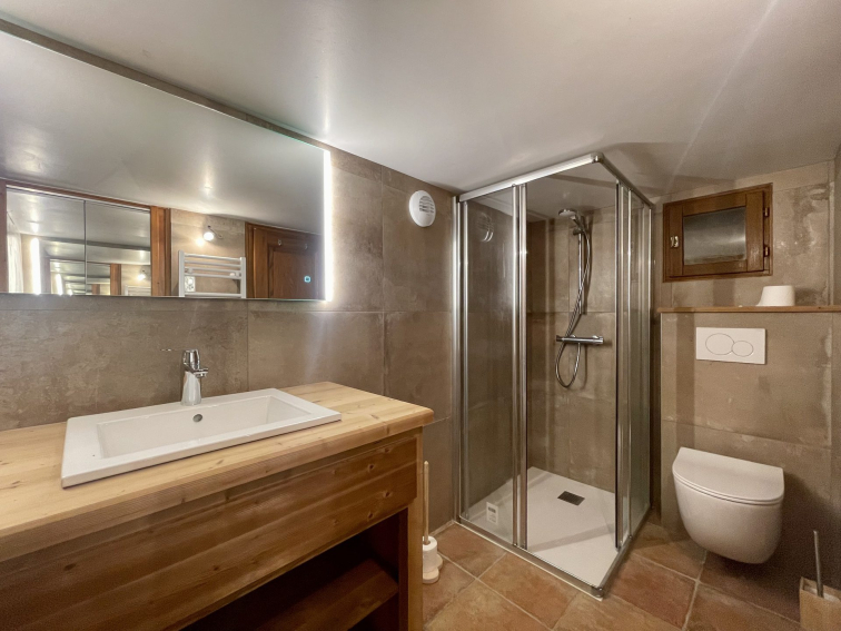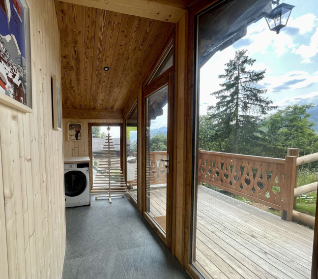 *1ER NIVEAU : buanderie avec lave-linge/séchant, et terrasse solarium face au Mont Charvin. Salle de bains avec douche à l'italienne (attention, hauteur sous plafond <1.90m). Accès à l'étage supérieur par l'escalier en colimaçon.