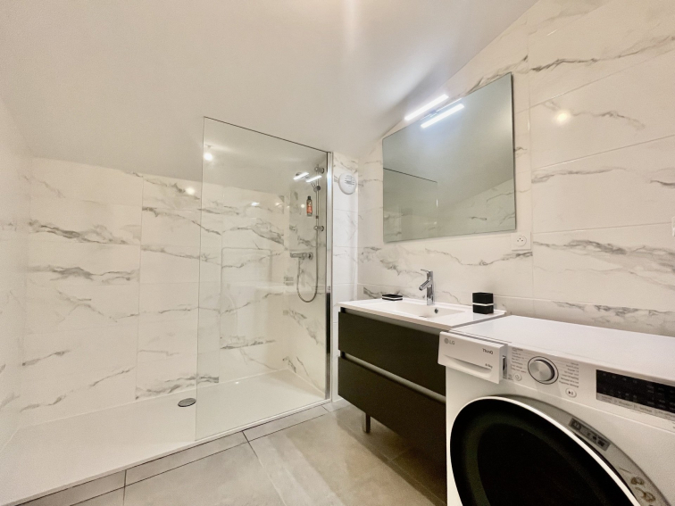 - Cuisine ouverte sur séjour : réfrigérateur, four, plaque électrique, lave-vaisselle, micro-ondes et hotte.
