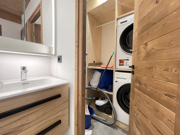 - Une salle de bains avec baignoire, douche, double vasque et accès à un toilettes indépendant, et buanderie avec lave-linge et sèche-linge.