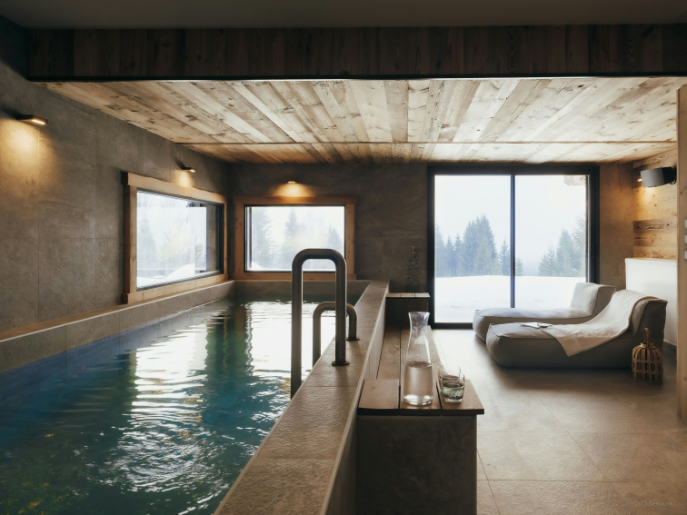 C’est au rez-de-chaussée que vous trouverez les équipements les plus célébrés du Chalet 1786 : une merveilleuse piscine intérieure chauffée et une salle de cinéma très confortable, équipée d’un système audio SONOS. Une buanderie très pratique inclut lave-linge et sèche-linge.