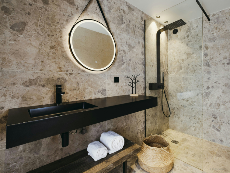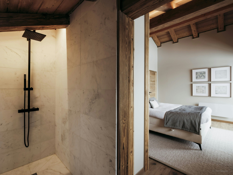 Deux premières chambres se trouvent à cet étage, tandis que les trois autres sont aménagées à l’étage supérieur. Le fait que chacune des quatre chambres doubles possède sa propre salle de douche est un avantage particulièrement pratique. Trois d’entre elles comptent également une télévision, dont une offre même le plaisir d’un balcon privé !