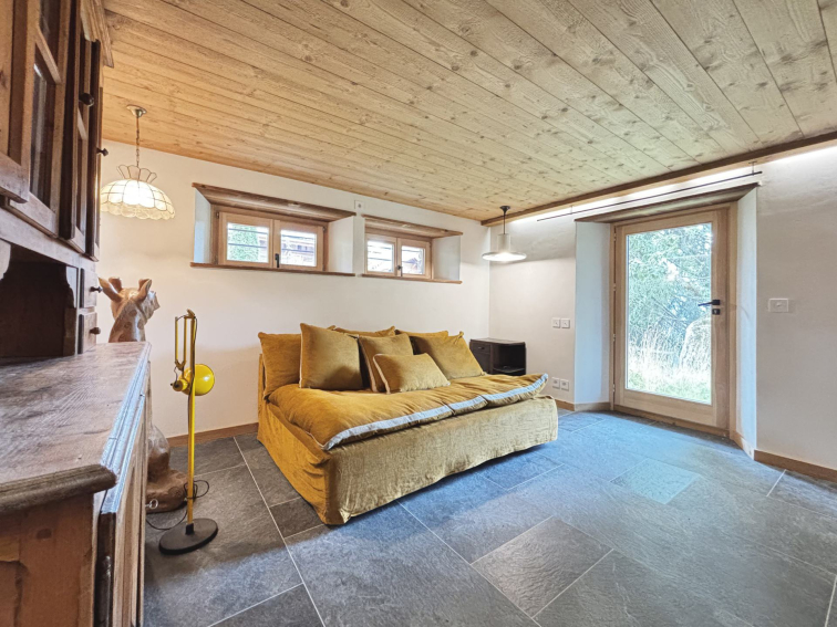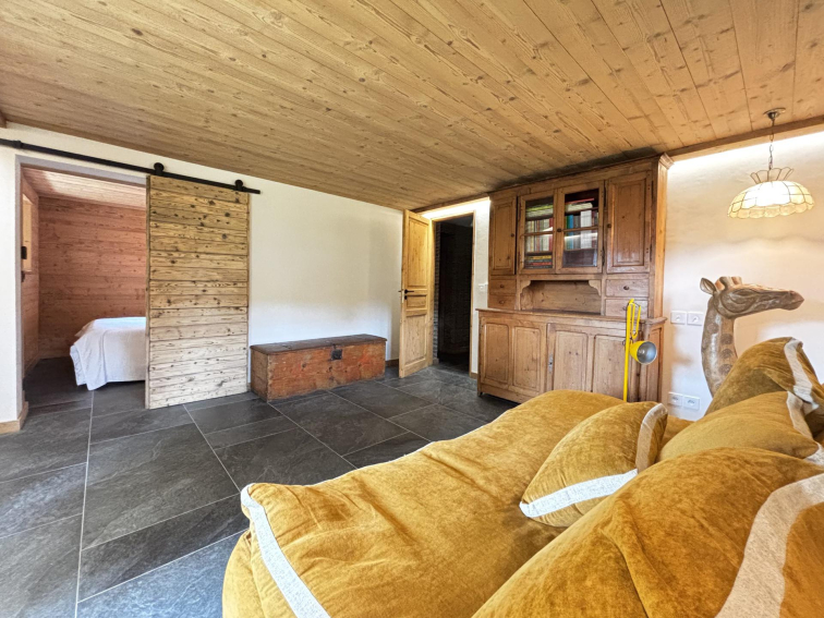 Pièce polyvalente utilisée comme « dortoir », équipée d?un canapé-lit de 140 cm, en enfilade avec la quatrième chambre et offrant un accès direct au terrain extérieur