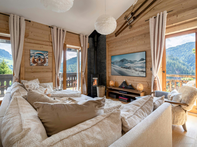Deux balcons prolongent cet espace. L’un invite à dîner en plein air, tandis que l’autre offre deux fauteuils tournés vers les sommets du Val d’Arly, parfaits pour savourer un café ou un moment de détente.