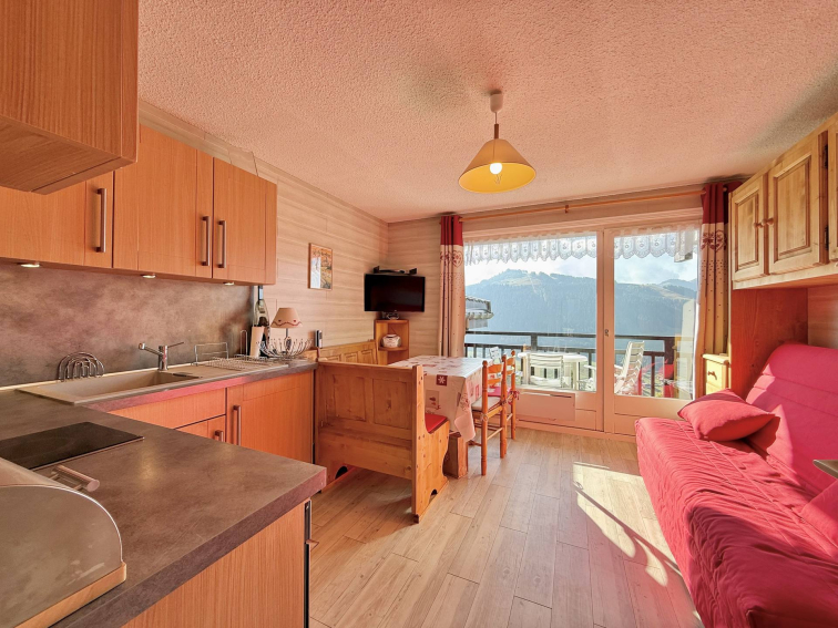 NOTRE AVIS : Il est bien optimisé pour un petit espace, lumineux, et offre une très belle vue. Il conviendra parfaitement à un couple ou une petite famille. En été, vous pourrez profiter d'un vaste domaine ainsi que de terrain de tennis réservés aux résidents. Au départ de fabuleuses randos.