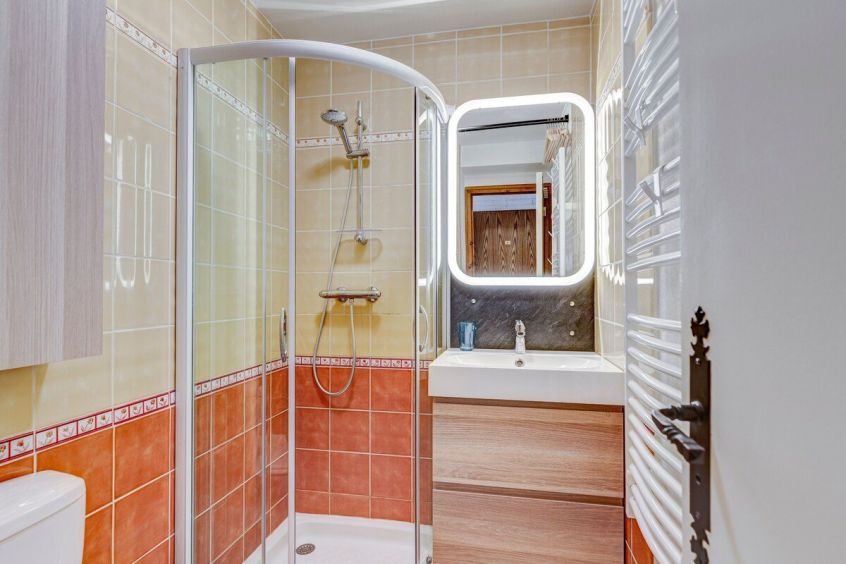 - une salle d’eau avec une douche, un meuble évier, un wc et un sèche-serviettes chauffant et soufflant.