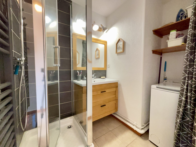 Une salle d?eau avec douche, meuble vasque et machine à laver